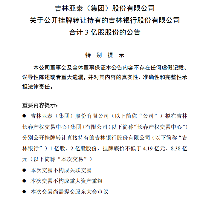 此後股東層面的動作便接踵而至,今年7月21日,主要股東之一吉林亞泰集團發佈公告,宣佈因“優化資產負債結構、補充流動資金”的經營需要,擬在吉林長春產權交易中心公開掛牌轉讓其直接持有的吉林銀行共計3億股股份(分1億股和2億股兩個標的),掛牌底價合計不低於12.57億元(即每股不低於4.19元)。此前亞泰集團直接持有7.04億股(佔比5.36%),並通過全資子公司亞泰醫藥集團間接持有2億股(佔比1.52%)。轉讓完成後,亞泰集團的總持股將降至6.04億股,對應持股比例降至4.60%。