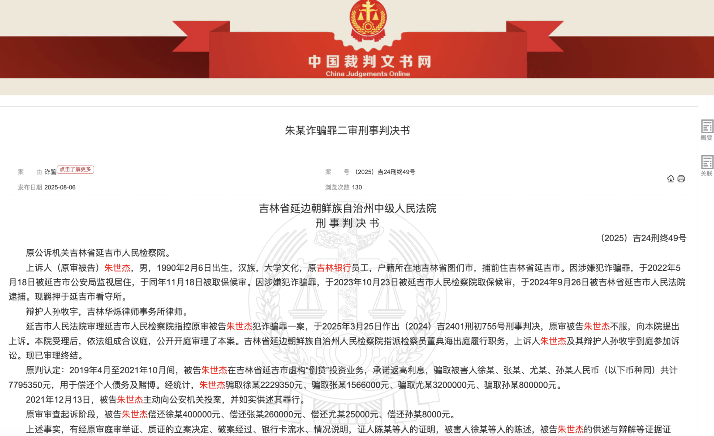 近日,吉林省延邊州中級人民法院終審落槌,吉林銀行前員工朱世傑因虛構"倒貸"業務詐騙733.7萬元獲刑十年十一個月。