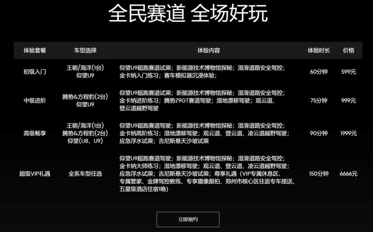 比亞迪鄭州賽車場的打造,則試圖繞過這一傳統營銷理念。從價格來看,比亞迪延續了在“技術平權”上的低價策略,將其賽車場的體驗價格劃分4個檔位,消費者最低只需599元就能夠體驗到幾乎所有的賽場項目,而想要進階學習自行賽道駕駛的消費者,其價格也在千元級別。