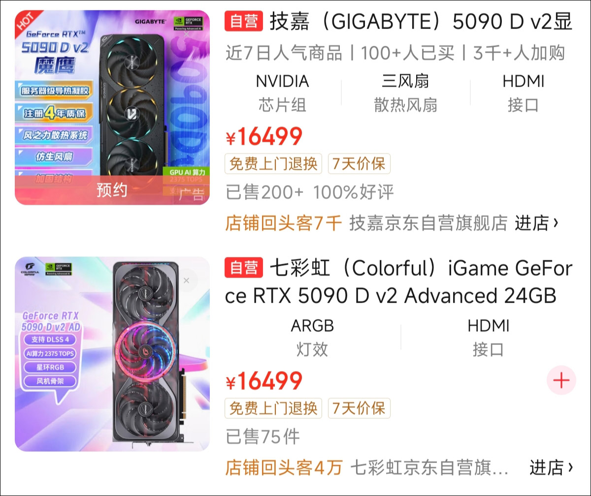 觀察者網在電商平台上查詢發現,目前,華碩、七彩虹、技嘉等廠商已全面上架了5090D v2,起售價16499元起,但部分旗艦、次旗艦型號價格已進一步上升至17499元乃至於接近19000元不等。此外,目前已被禁售的5090及5090D的新卡已“一卡難求”,在二手市場上也出現了不同程度的溢價。