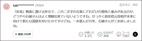 另一位網民表示,“‘反省’這兩個字的意義和分量,石破茂似乎並不太理解吧?明明已故的安倍前首相好不容易為日本的未來開闢了一條新路,結果石破茂你卻把前進的一步,變成了倒退的三步。”該評論獲得約3.3萬點贊。