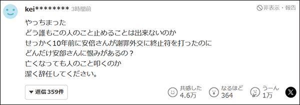一位網民評論道,“誰都不能阻止這個人(石破茂)嗎?明明十年前安倍才結束了‘道歉外交’,你(石破茂)對安倍究竟有多大的怨恨啊?人都去世了你還要攻擊他嗎?乾脆辭職吧。”該評論獲得約4.6萬點贊。