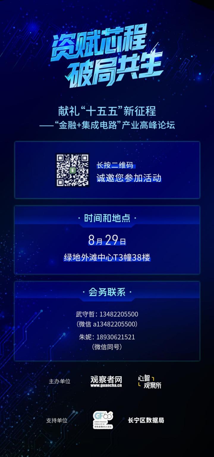 由觀察者網主辦的“金融+集成電路”產業高峯論壇將於2025年8月29日下午,在上海市金融高地——黃浦區綠地外灘中心T3幢38樓隆重召開。本次論壇由綠色金融60人論壇協辦,並得到上海市長寧區數據局的大力支持。