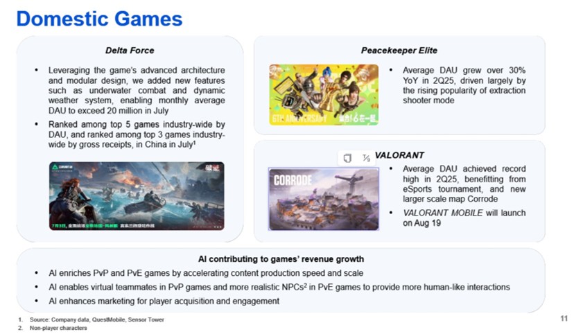談到遊戲部門的表現,騰訊董事會主席兼首席執行官馬化騰表示,《王者榮耀》及《和平精英》等長青遊戲向平台化進化並加大了AI的應用,新遊戲如《三角洲行動》亦取得了突破,使得騰訊的遊戲業務在用户及收入側均表現出色。