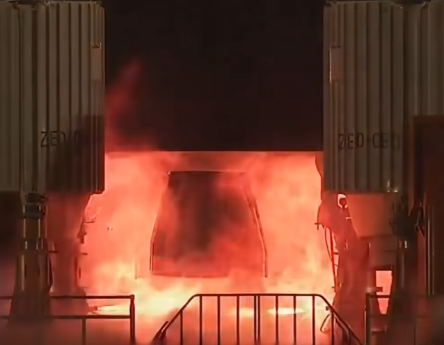此次試車的箭體不是完整的長征十號運載火箭一級貯箱。根據拍攝的畫面分析,火箭上部有一個稍短的覆蓋了聚氨酯保温層的液氧貯箱,下部有一個稍長的無保温煤油貯箱。這很明顯和其他液氧/煤油火箭貯箱的比例並不一樣,筆者推測這個試驗單元採用了完整的長征十號A火箭一級煤油貯箱,配置完整的隧道輸送管和承力裝置,同時截短了液氧貯箱。此外,既然是“首次”試驗,那可能很快就會有第二次靜態點火,以驗證重複使用能力,我們先拭目以待一下。