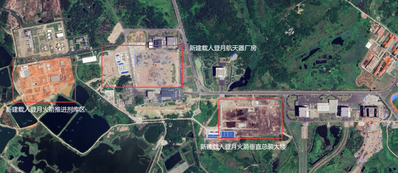 為支持載人登月工程,文昌航天發射場擴建了其推進劑庫區。在2024年8月22日的谷歌地球衞星圖片中可以看到4個巨大的地面儲罐,包括3個直徑20米的儲罐(可能是液氧和煤油)和1個直徑15米的儲罐(可能是液氫)。此外還擴建了用於支持載人登月的夢舟飛船和攬月着陸器的航天器廠房,從硬化地塊面積上看,載人登月航天器廠房的面積超過目前文昌航天發射場的衞星廠房和天舟飛船廠房面積總和。