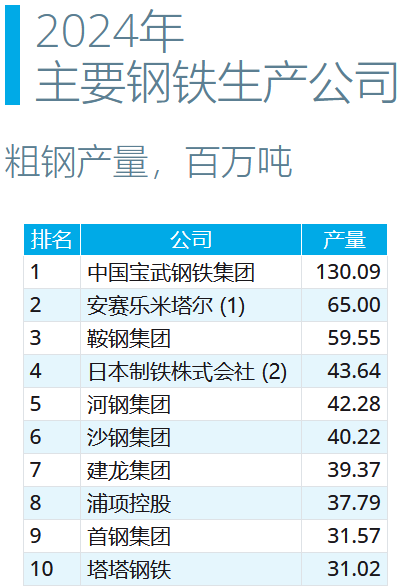 據國際鋼鐵行業組織“世界鋼鐵協會”(World Steel)6月發佈的最新數據,2024年全球主要鋼鐵生產國前三名仍為中國(粗鋼產量10.05億噸)、印度(1.494億噸)和日本(8400萬噸)。