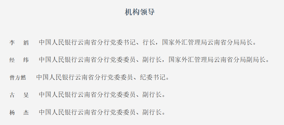 日前,中國人民銀行雲南省分行官網近日更新的“機構領導”信息顯示,李滔出任中國人民銀行雲南省分行黨委書記、行長,國家外匯管理局雲南省分局局長。