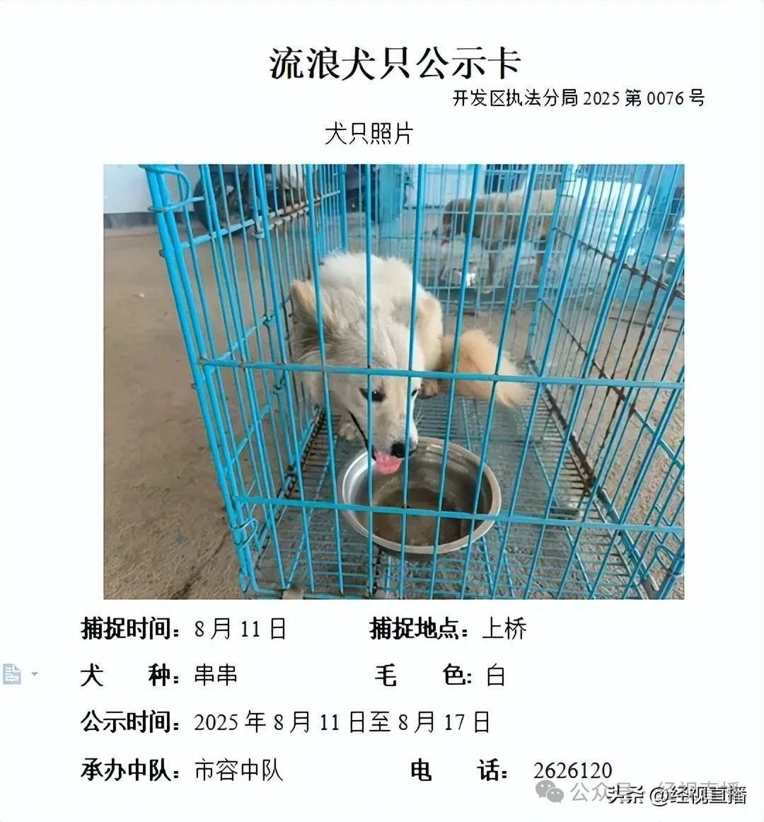 近日,浙江省麗水經開區流浪狗收容中心公眾號發佈的流浪犬捕捉情況公示引發關注。該公示由麗水市綜合行政執法局開發區分局發佈,公開了多隻被捕捉流浪犬的照片、捕捉時間、地點、犬種、毛色等信息,公示期至8月17日,期內原犬主可認領。不少網友關心:公示期後無人認領的流浪犬將如何處置?