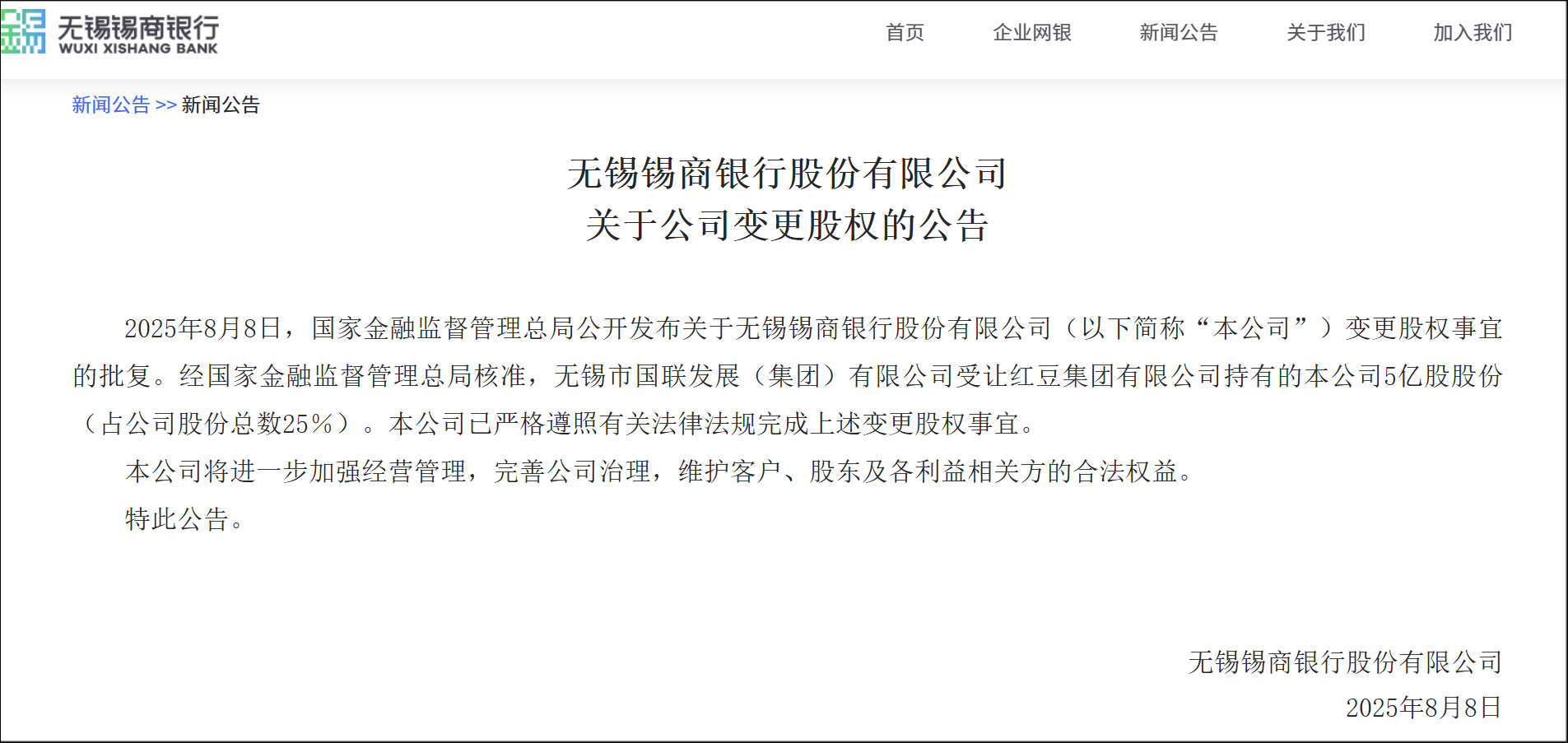 無錫錫商銀行8月8日發佈公告稱,8月8日,國家金融監督管理總局公開發布關於無錫錫商銀行股份有限公司(以下簡稱“本公司”)變更股權事宜的批覆。經國家金融監督管理總局核准,無錫市國聯發展(集團)有限公司受讓紅豆集團有限公司持有的本公司5億股股份(佔公司股份總數25%)。