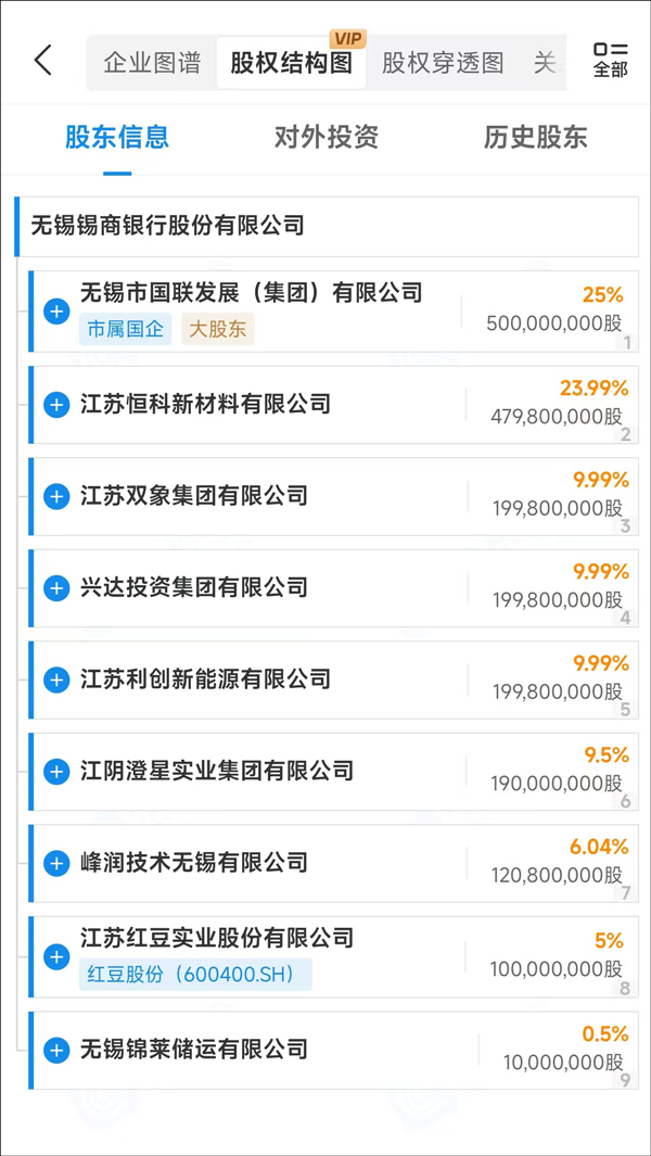 企查查APP顯示,無錫市國聯發展(集團)有限公司目前為錫商銀行最大股東,其次依次是江蘇恆科新材料有限公司、江蘇雙象集團有限公司、興達投資集團有限公司、江蘇利創新能源有限公司等。