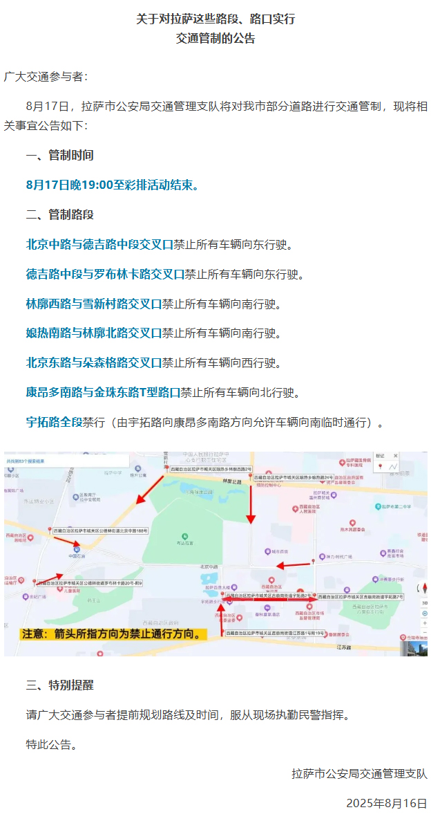 8月17日,拉薩市公安局交通管理支隊將對我市部分道路進行交通管制,現將相關事宜公告如下:
