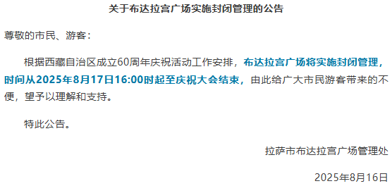 根據西藏自治區成立60週年慶祝活動工作安排,布達拉宮廣場將實施封閉管理,時間從2025年8月17日16:00時起至慶祝大會結束,由此給廣大市民遊客帶來的不便,望予以理解和支持。