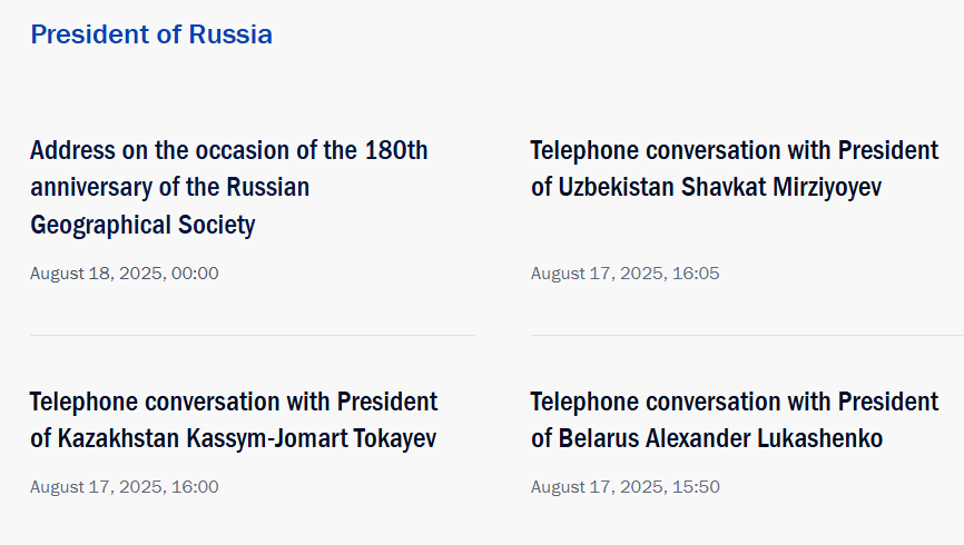 在阿拉斯加與美國總統特朗普會晤後,當地時間8月17日,據克里姆林宮新聞局消息,俄羅斯總統普京當天先後和白俄羅斯總統盧卡申科、哈薩克斯坦總統託卡耶夫、烏茲別克斯坦總統米爾濟約耶夫通了電話,向三國領導人通報了他與特朗普的此次“普特會”的情況。