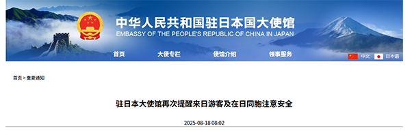 8月18日,中國駐日本大使館發佈消息,再次提醒來日遊客及在日同胞注意安全。
