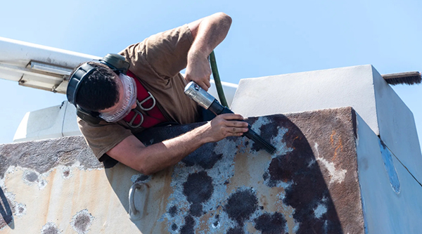 一名美國水手清理海軍艦艇上的鏽跡。 美國海軍