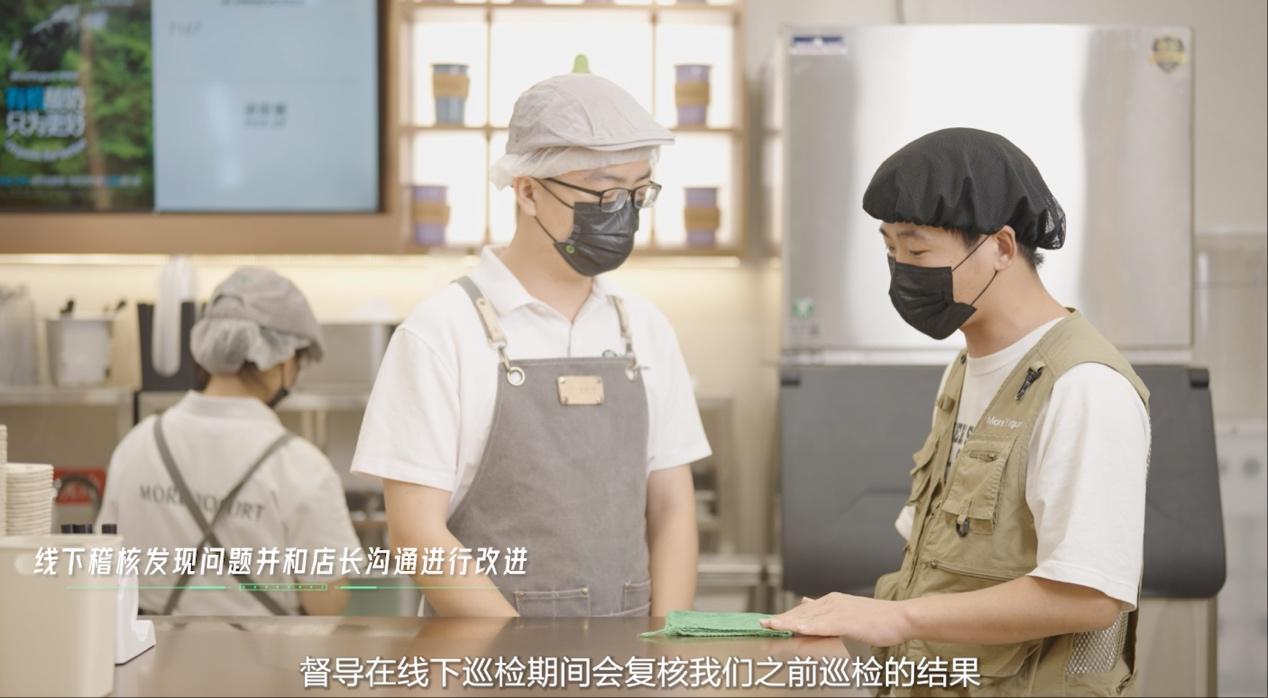 視頻中,直觀地展示了:門店店員與店長構成首道防線的守關人,承擔着 “日管控” 職責。從資質證照公示到操作枱消毒,從健康證核驗到原料效期排查,10 個維度的日常巡檢,讓每個操作環節都有規可循。督導團隊的 “周排查” 則形成第二重保障,每週定期到店,對衞生整潔度、設備運行狀態、員工操作技能、產品配方執行等進行全方位巡查,將潛在風險及時消除。公司高層則針對食安重點問題,進行整體資源的“月調度”排查和整改。