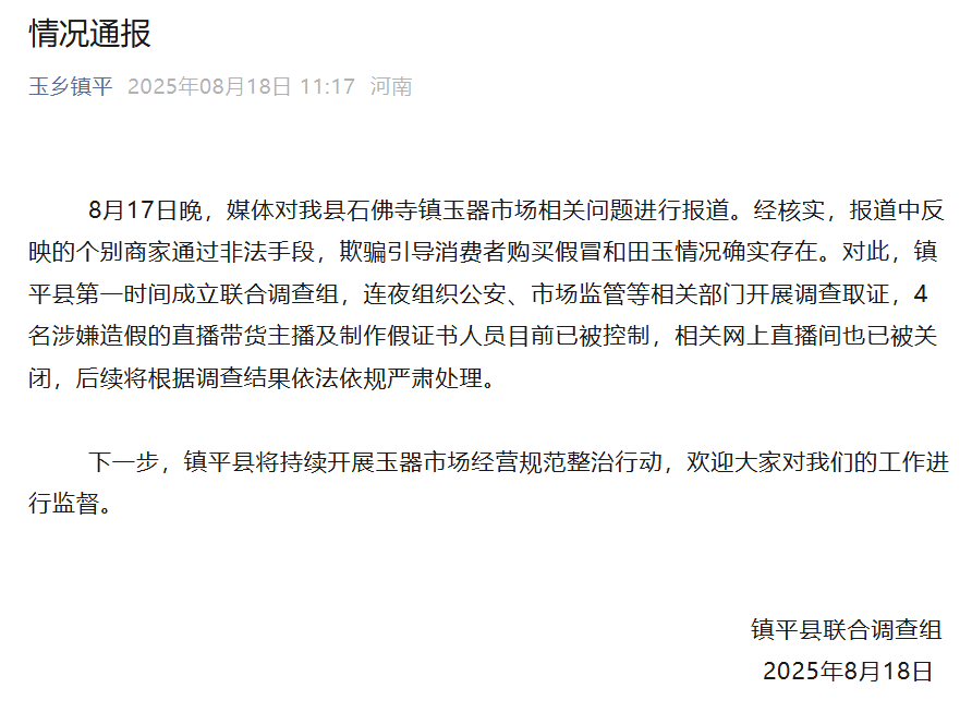 8月17日晚,媒體對我縣石佛寺鎮玉器市場相關問題進行報道。經核實,報道中反映的個別商家通過非法手段,欺騙引導消費者購買假冒和田玉情況確實存在。對此,鎮平縣第一時間成立聯合調查組,連夜組織公安、市場監管等相關部門開展調查取證,4名涉嫌造假的直播帶貨主播及製作假證書人員目前已被控制,相關網上直播間也已被關閉,後續將根據調查結果依法依規嚴肅處理。