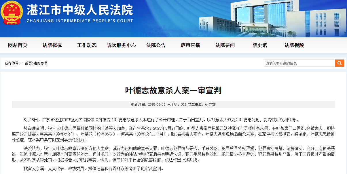 據廣東湛江市中級人民法院網站消息,8月18日,廣東省湛江市中級人民法院依法對被告人葉德志故意殺人案進行了公開審理,並於當日宣判,以故意殺人罪判處葉德志死刑,剝奪政治權利終身。