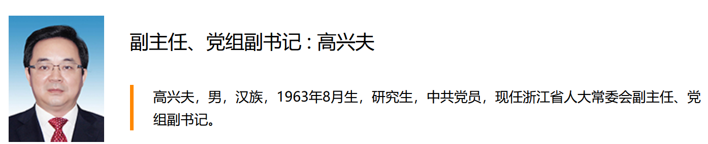 浙江人大網站顯示,高興夫,男,漢族,1963年8月生,研究生,中共黨員,現任浙江省人大常委會副主任、黨組副書記。