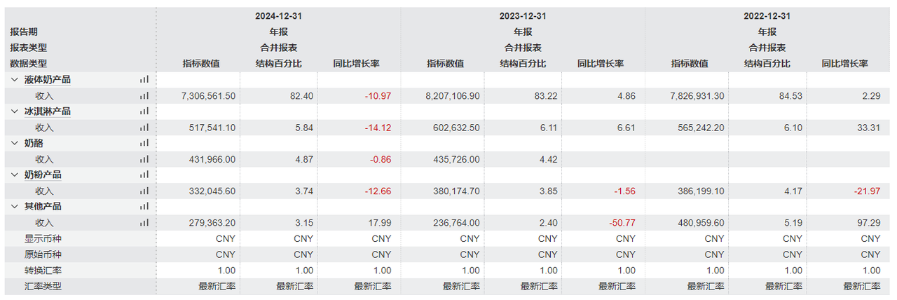具體到奶粉業務,2024年蒙牛奶粉收入33.20億元,佔整體營收3.74%,同比下降12.66%。此外,液態奶、冰淇淋和奶酪業務均出現不同程度下滑。
