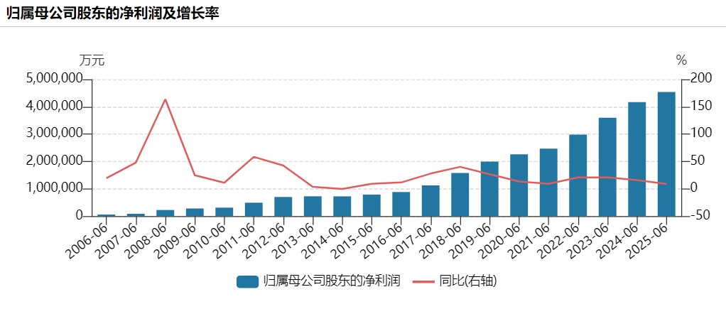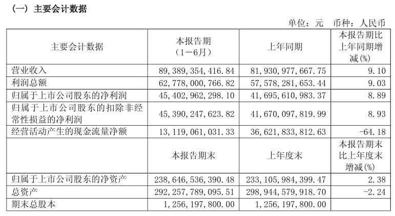 近日,貴州茅台(股票代碼:600519.SH)披露了2025年中期業績。報告期內,公司營業總收入910.94億元,同比增長9.16%;歸屬於上市公司股東的淨利潤454.03億元,同比增長8.89%。