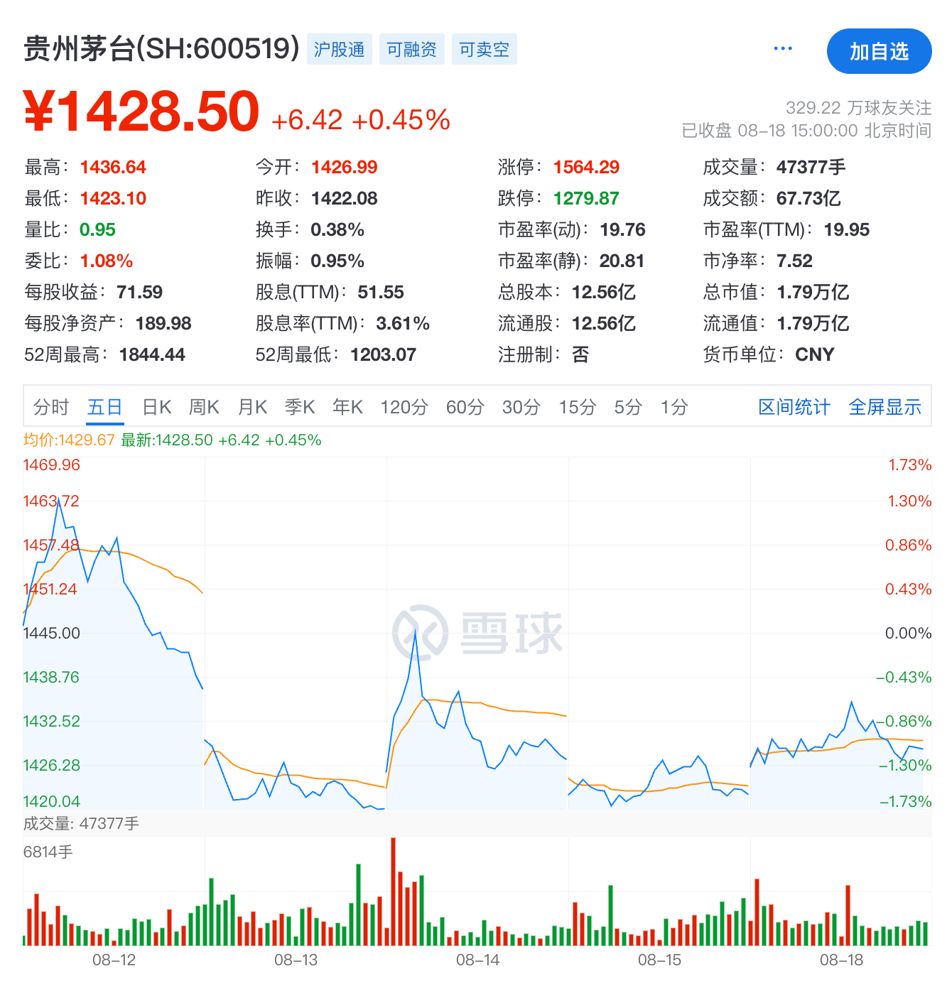 面對行業的持續調整,貴州茅台挖掘新增量的多元策略能否奏效,需要市場來給出答案。財報發佈後,茅台的股價持續走低,後略有回升,截至8月18日收盤,貴州茅台每股報1428.5元,總市值約1.79萬億元。