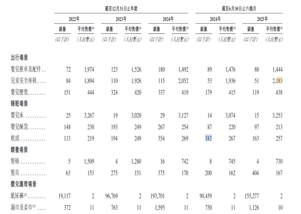 表現在數據上,截至2025年6月30日止六個月,BeBeBus嬰兒推車及配件、兒童安全座椅、嬰兒腰凳、睡眠場景嬰兒牀 、嬰兒睡袋、枕頭 、餐椅的平均售價分別為1444元、2183元、438元、3253元、213元、257元、730元。