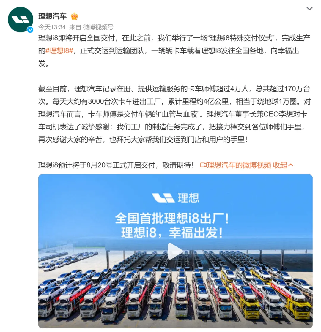 據微博@理想汽車 消息,8月18日,理想汽車舉行發運儀式,標誌着理想i8正式進入全國交付前的運輸階段。