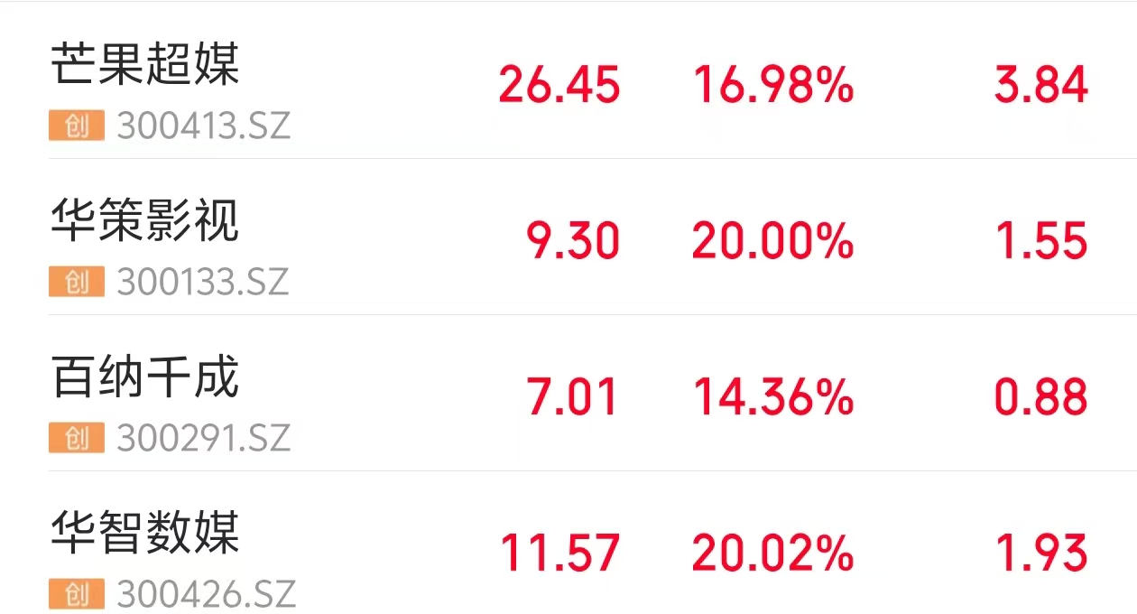 收盤時,華策影視和華智數媒維持漲停,芒果超媒和百納千成打開漲停。
