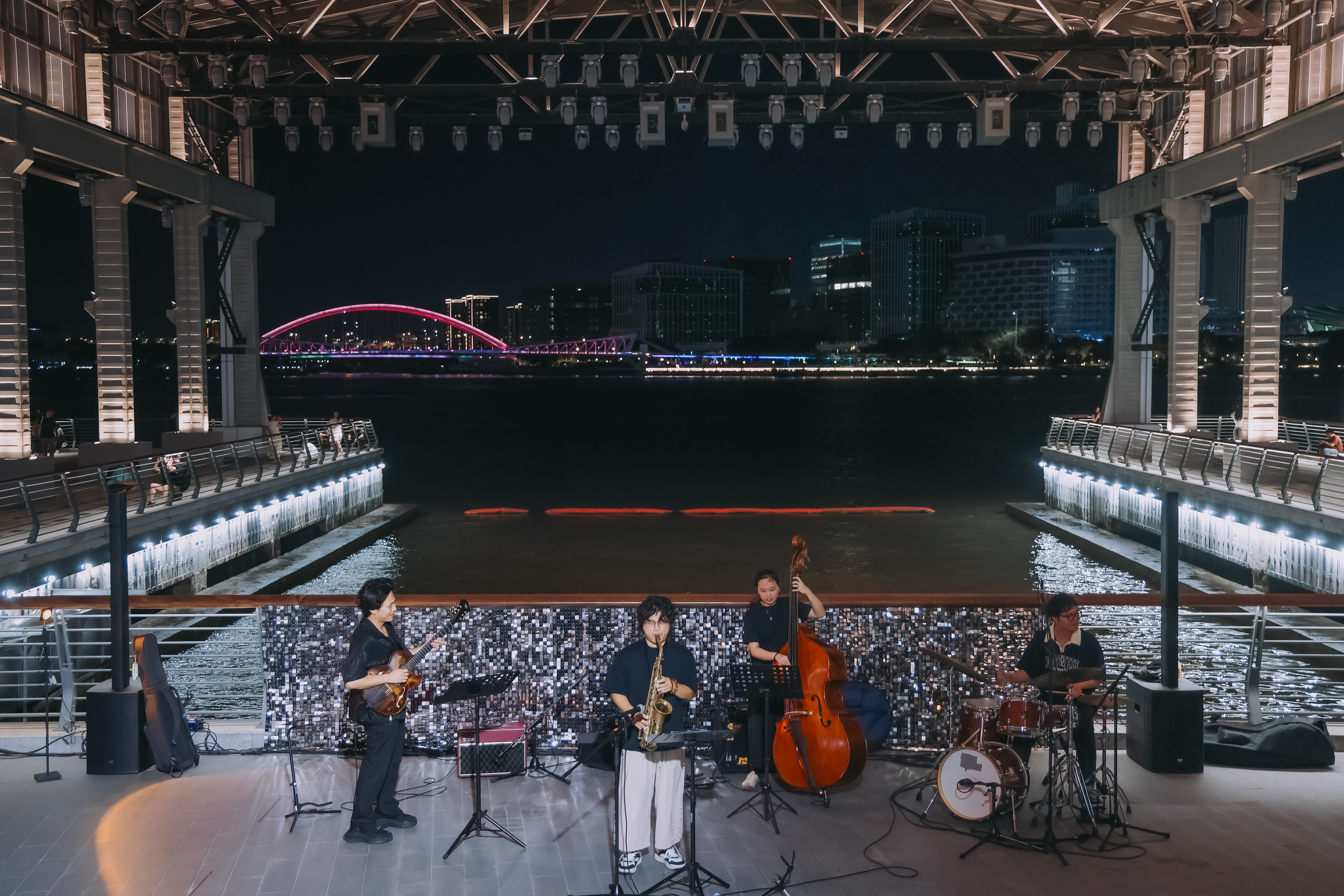 西岸夢中心以獨特濱水空間為載體,聯合JZ Music沿江打造三大沉浸式音樂舞台。「水岸劇場」成為落日餘暉中的音樂主場,專業樂隊與歌手(如秦凡淇、恩佳和她的朋友們)輪番登場,聲浪隨江波盪漾。「船塢劇場」是 百年工業碼頭變身的天然舞台,觀眾席沿階而坐,聆聽如《浮·時 四重奏 Time Shift Quartet》、Smiriti等樂隊在工業遺蹟懷抱中吟唱時光故事。「毛茸茸劇場」成為 南區葱鬱草坪上的“毛孩子友好”空間,Midnight Trio的音樂響起,解鎖人寵共度的獨特夏夜體驗,將草坪變身為日落隨性搖擺的音樂現場。
