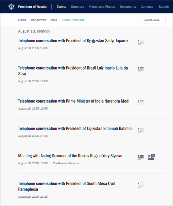 在阿拉斯加與美國總統特朗普會晤後,當地時間8月18日,俄羅斯總統普京當天分別致電印度總理莫迪、巴西總統盧拉、南非總統拉馬福薩、塔吉克斯坦總統拉赫蒙及吉爾吉斯斯坦總統扎帕羅夫,向多國領導人通報了他與特朗普的會晤情況。
