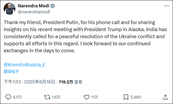 印度總理莫迪隨後在社交平台X上發文表示,感謝“我的朋友”普京總統來電,並分享了會晤見解。