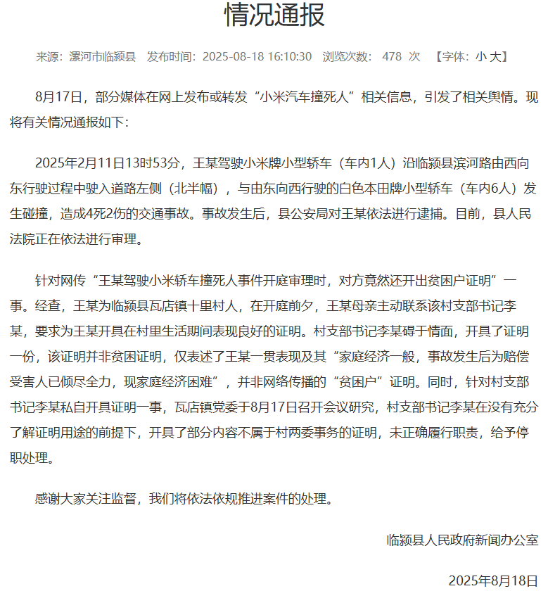 針對網傳“王某駕駛小米轎車撞死人事件開庭審理時,對方竟然還開出貧困户證明”一事。經查,王某為臨潁縣瓦店鎮十里村人,在開庭前夕,王某母親主動聯繫該村支部書記李某,要求為王某開具在村裏生活期間表現良好的證明。村支部書記李某礙於情面,開具了證明一份,該證明並非貧困證明,僅表述了王某一貫表現及其“家庭經濟一般,事故發生後為賠償受害人已傾盡全力,現家庭經濟困難”,並非網絡傳播的“貧困户”證明。同時,針對村支部書記李某私自開具證明一事,瓦店鎮黨委於8月17日召開會議研究,村支部書記李某在沒有充分了解證明用途的前提下,開具了部分內容不屬於村兩委事務的證明,未正確履行職責,給予停職處理。
