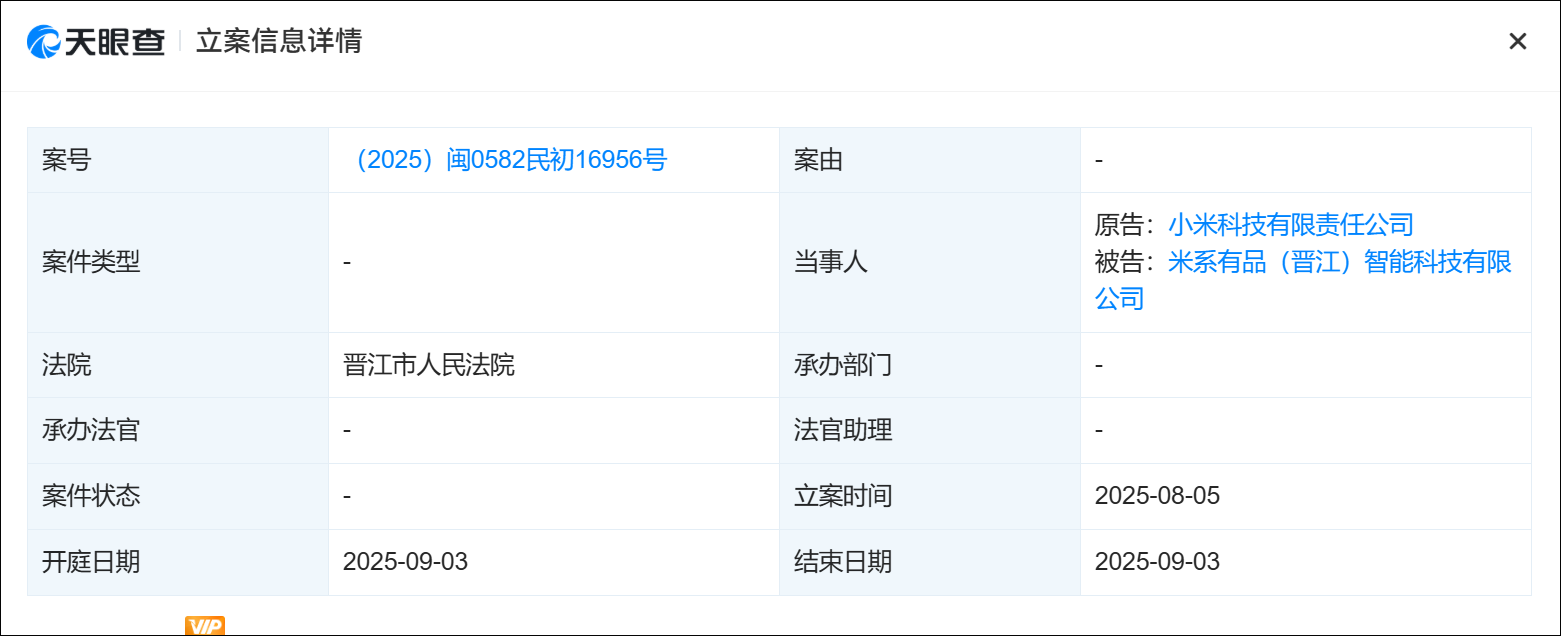 近日,天眼查顯示,小米科技有限責任公司(以下簡稱為小米)新增多起開庭公告,其中小米與米繫有品(晉江)智能科技有限公司相關侵害商標權案件已有進展,該案件將於9月3日在晉江市人民法院開庭審理。