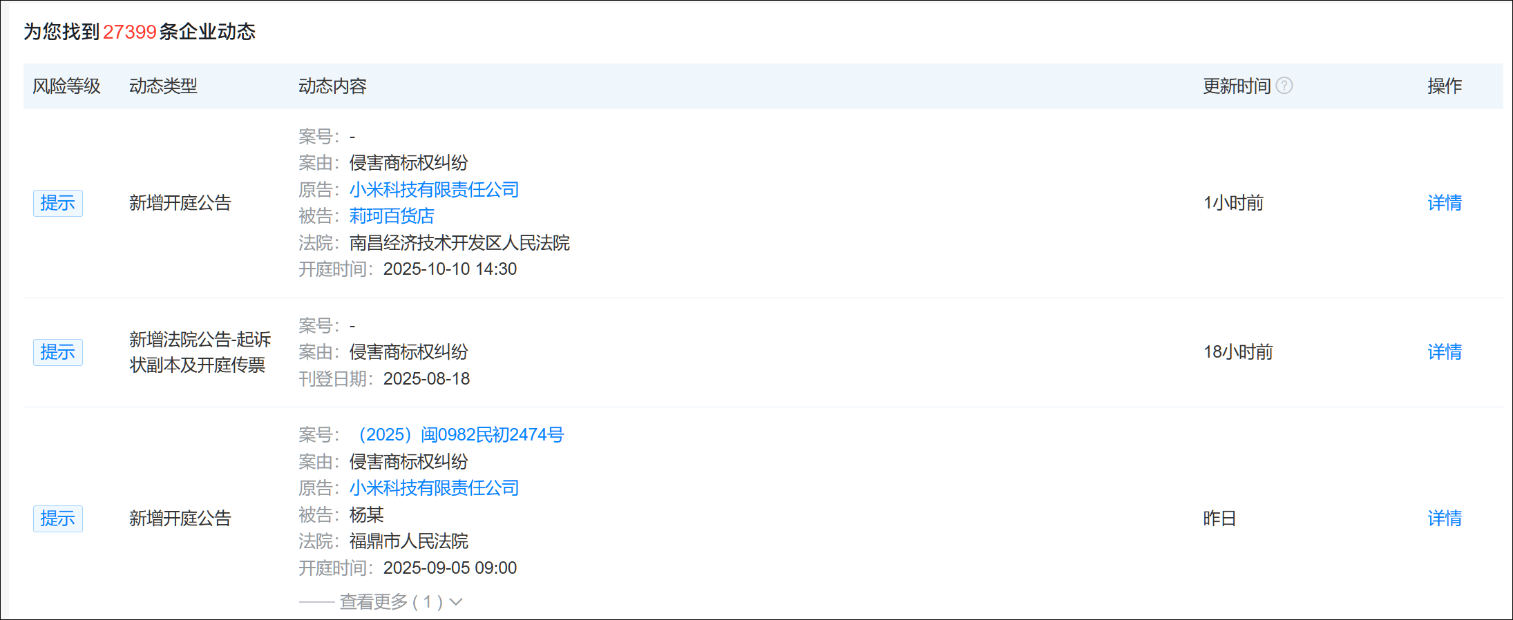 此外,小米還新增了三起與不同個人、企業的開庭公告。三起案件中,小米均為原告方,案由均為侵害商標權糾紛。