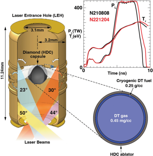 根據美方公佈的論文和圖片,2022年12月引發世界關注的實驗中的靶丸相比於早年的設計又有所改進,四次實驗的靶丸外部採用貧鈾鍍金的圓柱形黑腔封裝;圓柱形黑腔的中心放置裝填有氘氚的靶丸,靶丸由外向裏的結構為:微晶金剛石組成的高密度碳、氘氚冰和氘氚氣體。
