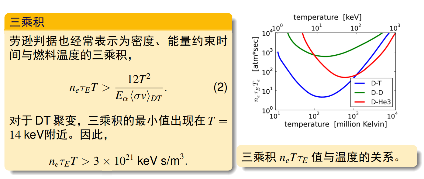 慣性約束和磁約束究竟差距有多大。這裏我們可以引入一個至關重要的概念,也就是聚變三乘積,從數據的角度直觀感受不同路線之間的差別。所謂聚變三乘積就是衡量聚變系統是否能實現自持聚變反應(點火)和能量增益的基本判據,也就是等離子體中離子密度n(公式中密度的單位通常為每立方米粒子數)、温度T(單位為千電子伏特,1電子伏特約等於11605K)、能量約束時間τ(單位為秒)的乘積。只有當聚變三乘積達到或超過某一閾值時,聚變反應才能實現自持燃燒。