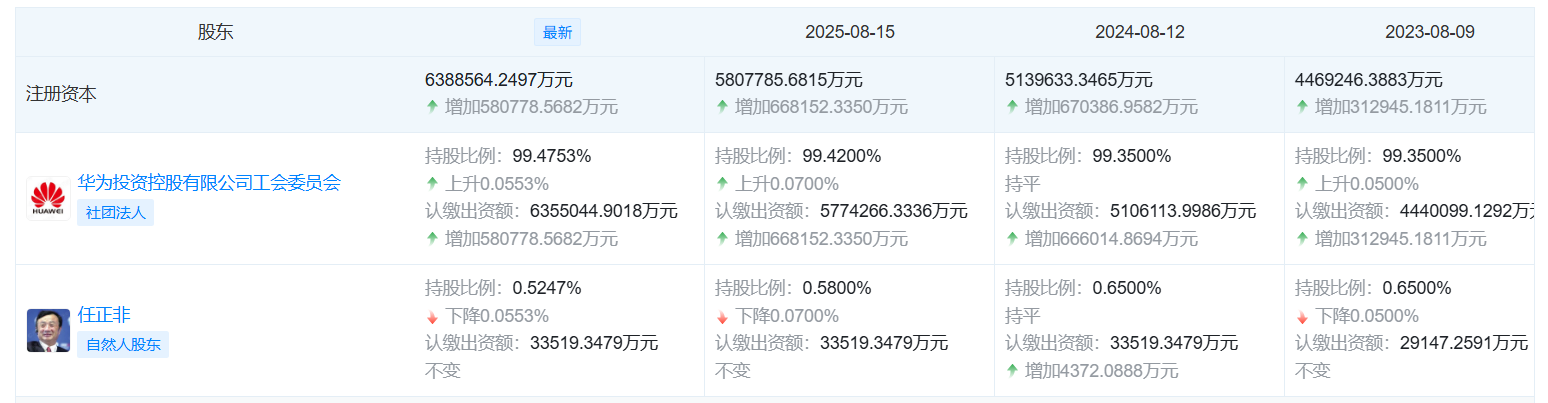 此前,華為投資控股有限公司工會委員會在2024年8月和2023年8月也曾增加認繳出資額,兩次分別增加666014.8694萬元和312945.1811萬元。