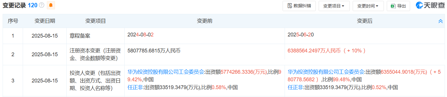 據天眼查公開信息,8月15日,華為投資控股有限公司完成多項工商變更登記。其中,公司註冊資本由5807785.6815萬元人民幣增至6388564.2497萬元人民幣,增幅達10%。