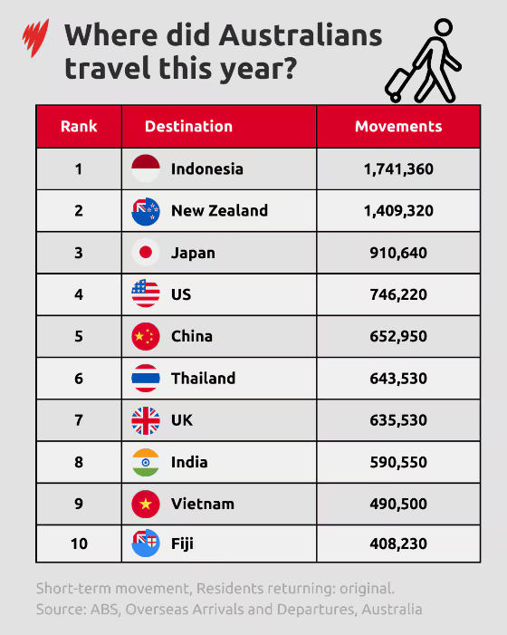 2024—2025年的具體數據顯示,印度尼西亞(尤其是巴厘島)以約174萬人次高居榜首,佔澳大利亞出境遊客總量的14%。日本以91萬人次躍居第三位。與2014—2015年相比,赴日旅遊的澳大利亞遊客數量增長了兩倍。