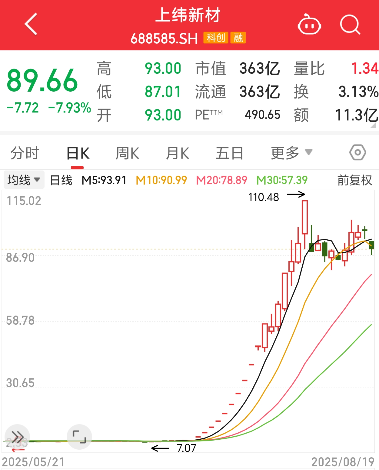 截至8月19日下午發稿,上緯新材股價跌7.93%,報89.66元/股。