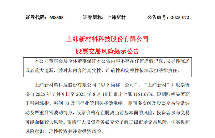 8月19日,經歷30天連漲,一度衝上此前15倍股價的上緯新材官方就近期股價交易波動發佈風險提示,稱公司基本面未發生重大變化,但近期公司股票交易價格已嚴重脱離公司目前的基本面情況,投資者參與交易可能面臨較大的市場風險。