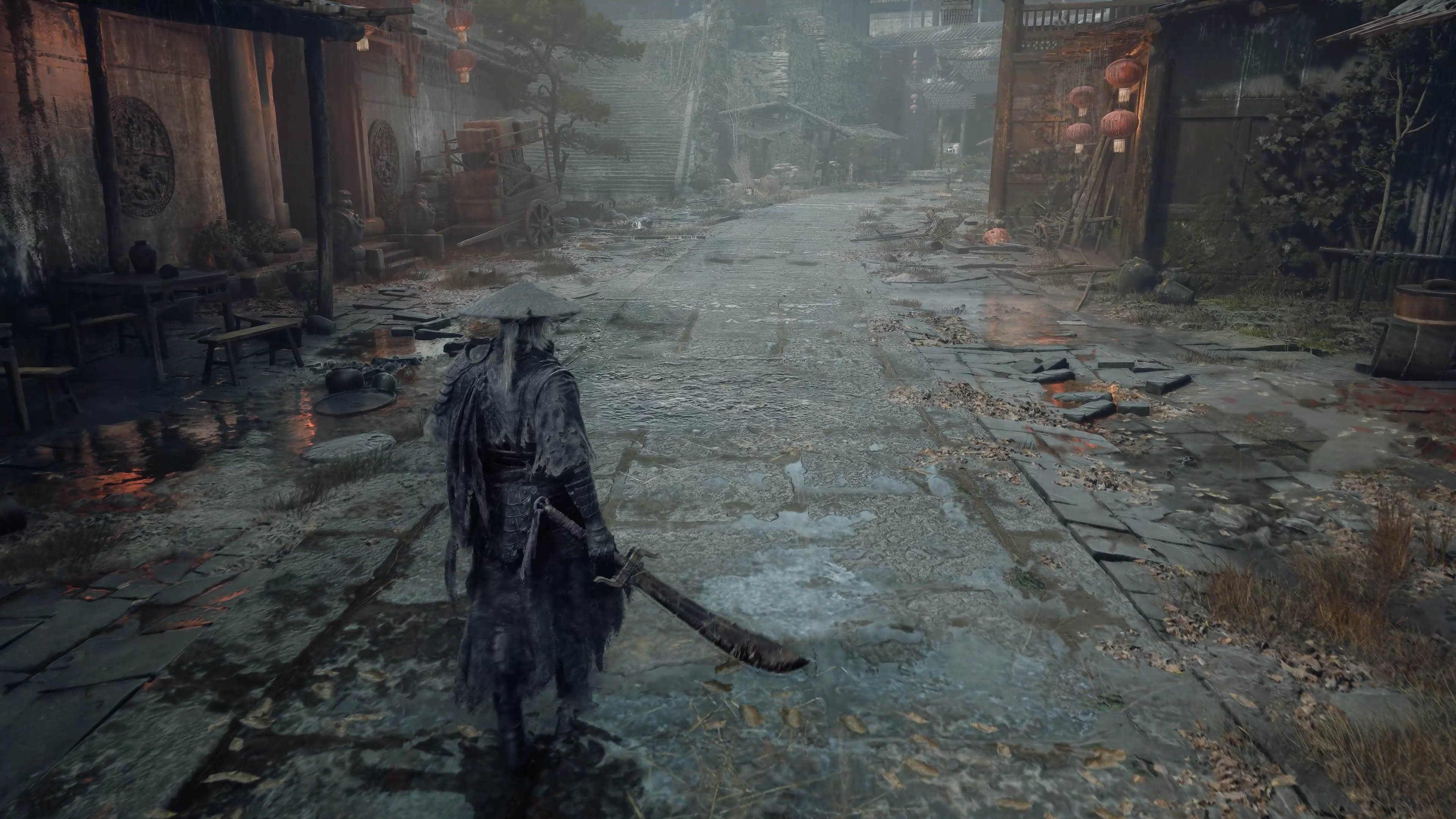 在RTX光追技術的加持下,場景中的大量物體都可以進行破壞,主角魂對敵人進行反擊和處決的動作一氣呵成,空中飛濺而出的雨水,地面積水對人物映射出的倒影,古建築的光影變化,以及濕潤石板路面的真實質感,都得到了極致呈現。