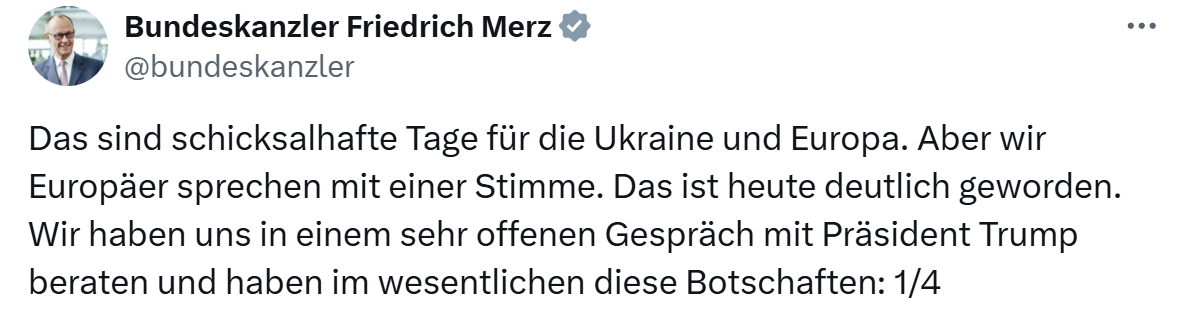 會後,默茨也在社媒平台X發文,讚揚了會談“富有建設性”的氛圍以及歐洲各國間的“良好合作”。他表示,歐洲各國已實現“用同一個聲音發聲”,“這一點對我而言尤為重要。”