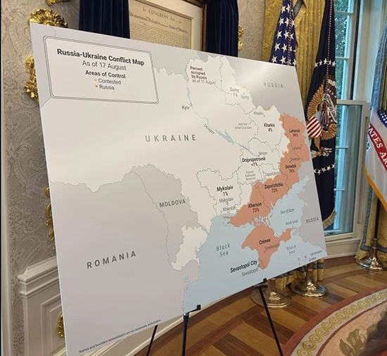 當地時間8月18日,一位德媒記者在社交平台X發文稱,一張會議前展示的地圖被擺放在橢圓形辦公室的“堅毅桌”(Resolute Desk)後方,美烏克雙方領導人就坐時正好面對地圖。
