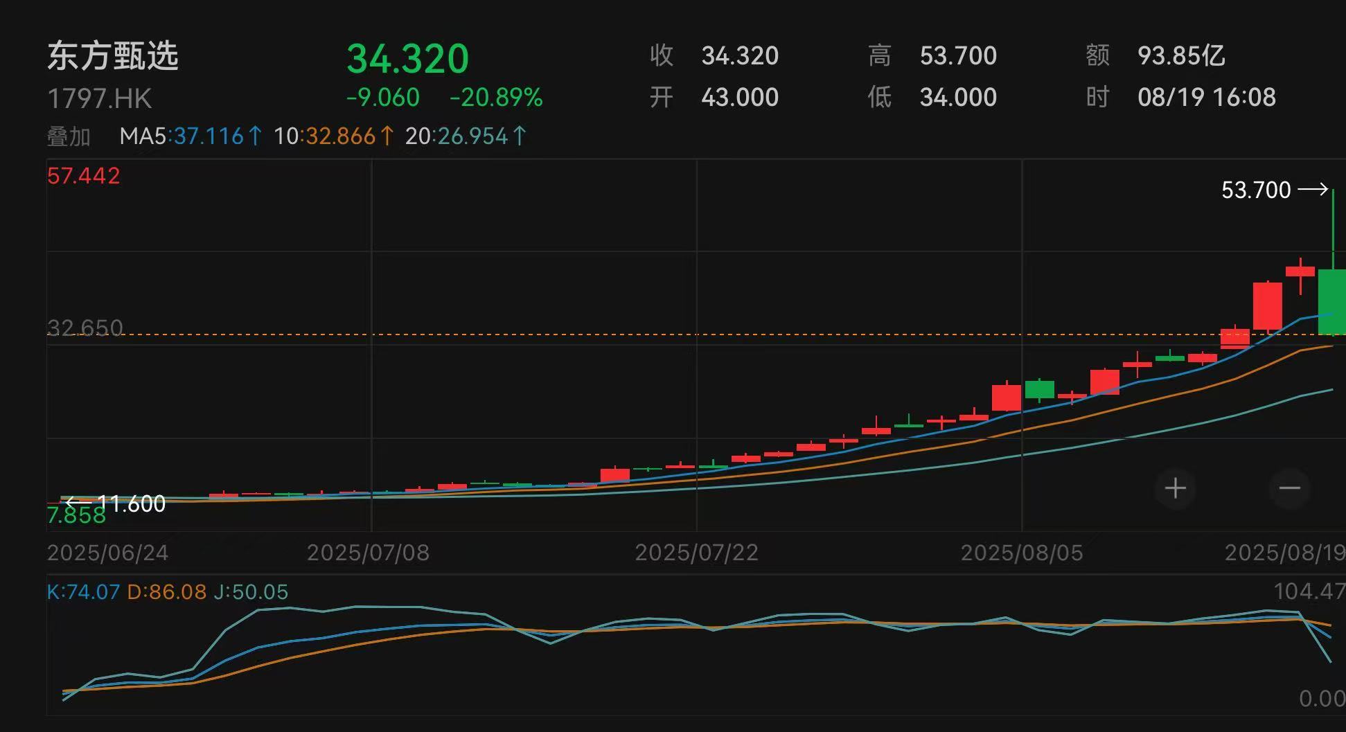 盤中,東方甄選股價一度上漲23.56%,但隨即跳水下跌,尾盤跌幅超20%,收報34.32港元/股,市值約為359億。