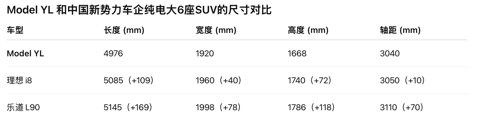 所以,Model YL最顯著的變化就是車身尺寸。不過,橫向對比理想i8、樂道L90等中國新勢力車企推出的純電大6座SUV,Model YL在尺寸上並不佔優勢。