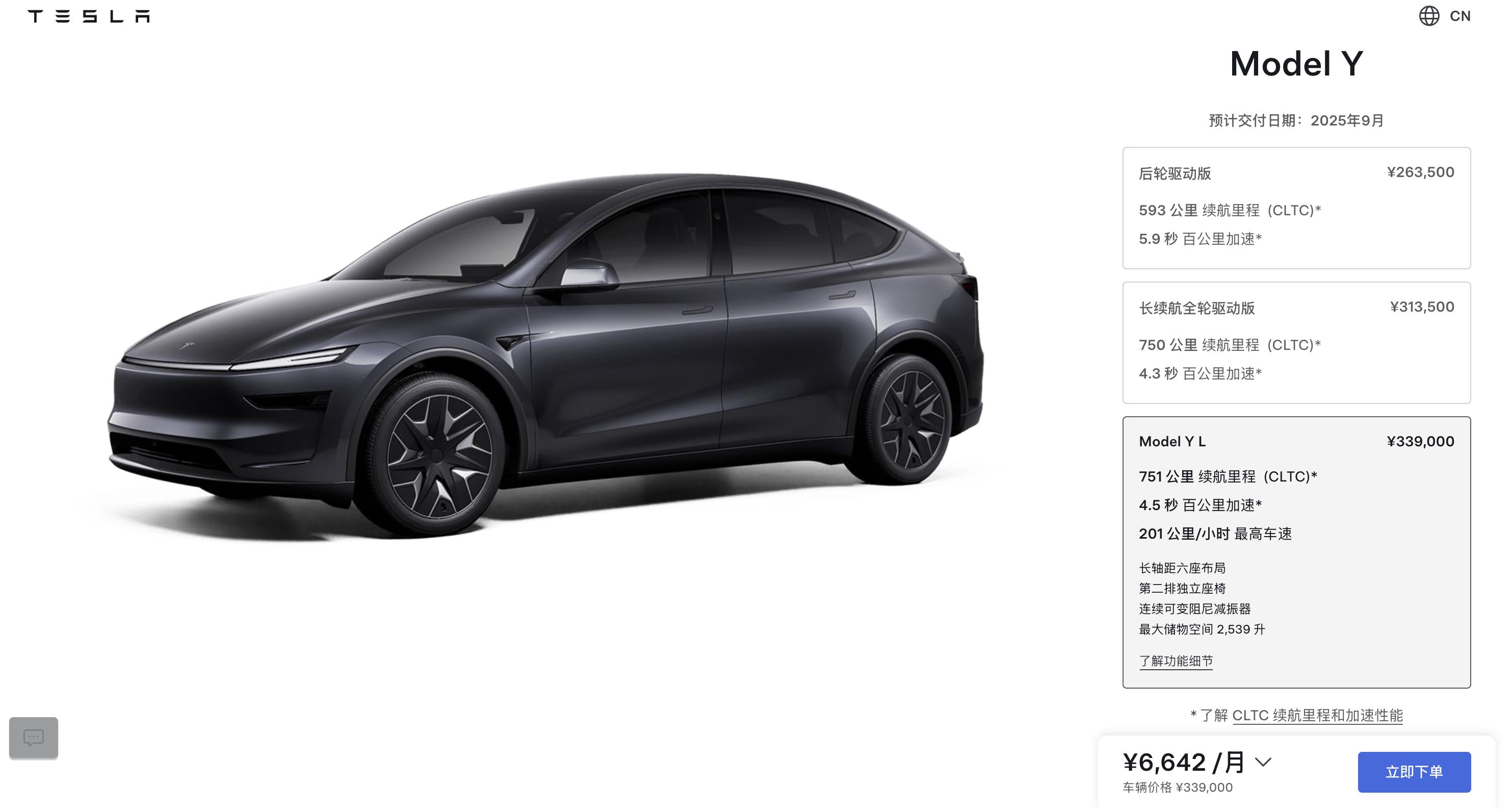 6座的佈局,重新設計的車身,加長179mm、增高44mm、軸距增加150mm——8月19日,特斯拉Model YL悄無聲息地在官網上線,售價33.9萬元。