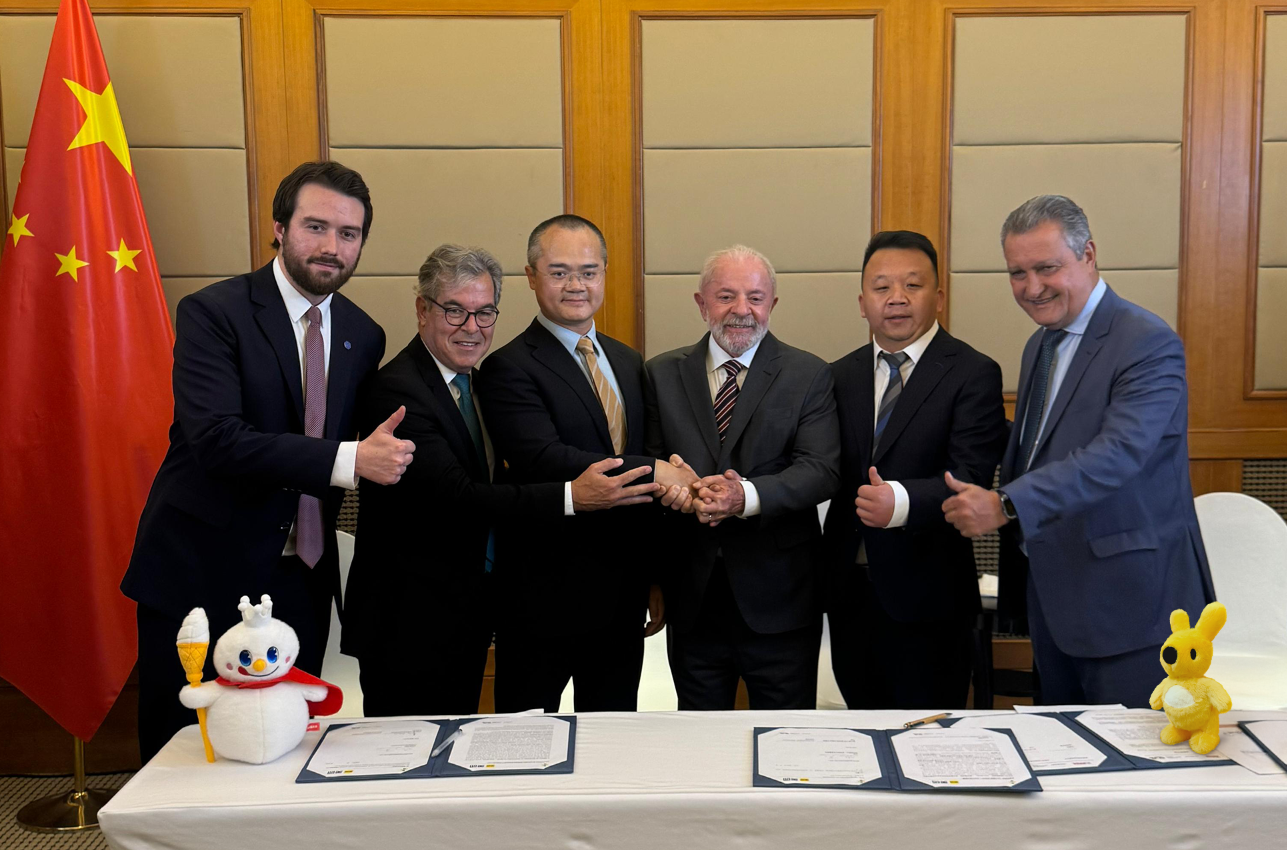 巴西總統盧拉(右三)與美團公司創始人王興(左三)會面。美團